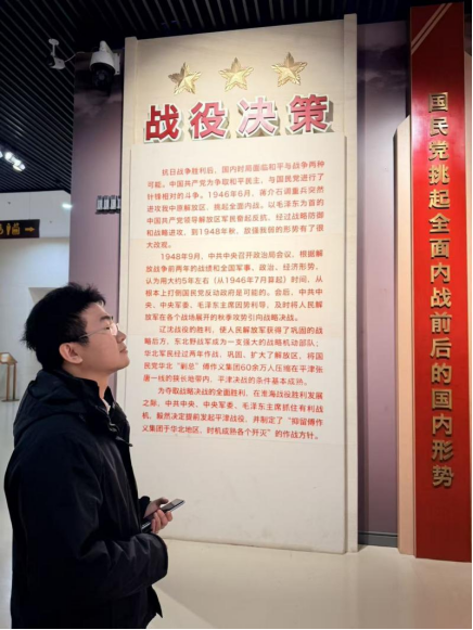 活动当日,同学们怀着崇敬的心情抵达庄严肃穆的平津战役纪念馆。在纪念馆宏伟的纪念碑和主题雕塑前,师生们列队肃立,感受历史的厚重与革命先烈的浩然正气。纪念馆内,丰富的历史文物、详实的文献资料、生动的图片影像以及逼真的场景复原,全方位、多角度地展现了平津战役那段波澜壮阔的革命历史。同学们紧跟讲解员的步伐,凝神聆听,仔细观看,革命先辈们为了民族独立和人民解放事业所展现出的坚定信念、不怕牺牲、浴血奋战的崇高精神,深深触动着每一位同学的心灵。这段历史,是中国共产党领导各族人民为争取民族独立、人民解放而共同奋斗的缩影,是中华民族伟大团结精神的生动体现。