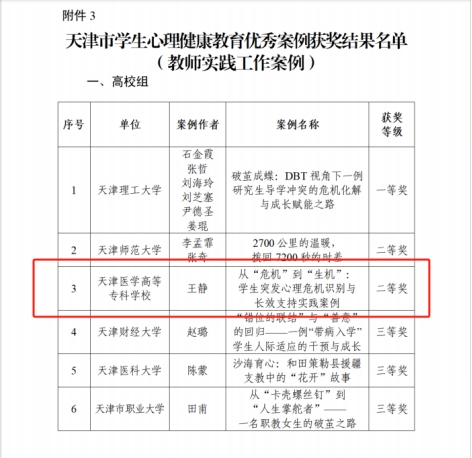 教师实践工作案例:《从“危机”到“生机”:学生突发心理危机识别与长效支持实践案例》荣获二等奖。