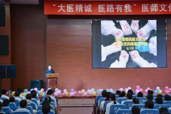 在本次医师文化节报告会中邀请了天津医院副院长、天津市抗击新冠疫情劳动模范徐卫国同志亲临现场作报告。徐院长和师生分享了他在疫情之初执甲逆行、驰援武汉的抗疫事迹,在场的同学听到徐院长讲述初到武汉之时,面对物品不足、药品匮乏等困境,医务工作者们迎难而上的情况,很多同学都眼含泪花。听完报告后,同学们纷纷表示作为一名未来的医师要以实际行动向徐院长学习,传承医师精神,不负时代、不负韶华。