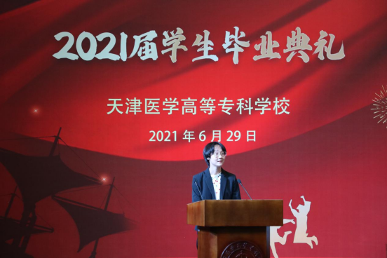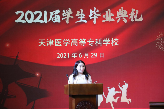 教师代表储媛媛老师也为毕业生送上临行前的祝福与期望,2021届的毕业生经历了新冠肺炎的严峻考验,也迎来了建党百年的光辉时刻,作为将亲历“两个一百年”交汇的新时代医专学子,作为奋斗在临床一线的医务工作者,希望同学们继续秉承“严谨、求实、创新、奉献”的校训,在工作岗位上践行“敬佑生命、救死扶伤、甘于奉献、大爱无疆”的医疗卫生精神。
