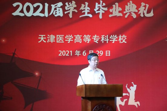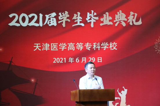 张彦文校长对毕业生深情寄语,向圆满完成学业的2021届医专学子们致以热烈的祝贺,向辛勤耕耘、默默付出为学生成长成才作出贡献和服务的实践基地的校内外老师及工作人员和家长致以崇高的敬意和衷心感谢。张校长带领同学们一同回忆三年来国家和个人发展的关键时刻,同时,向毕业生们提出三点希望:第一,希望同学们心怀梦想,做一个有家国情怀的人;当今世界正处于百年未有之大局,机遇挑战并存,同学们要不忘初心,与时代同心同向同行,将个人成长与国家发展、民族复兴结合起来;把个人梦想与同国家民族的梦想熔铸起来,在实现医药强国梦,推动人类卫生事业发展的伟大征程中书写时代青春华章;第二,希望同学们爱党敬业,做一个有担当作为的人;要爱岗敬业,做好工作,不断学习,掌握工作标准要求;要学以成人,涵养道德情操;要有担当有作为,尽你所学造福家乡、造福群众;第三,希望同学们恪守医德,做一个诚实守信的人;时刻牢记“健康所系,性命相托”的医学生誓言,希望大家在掌握精湛医技之时,砥砺崇高的医德,践行学校理念。