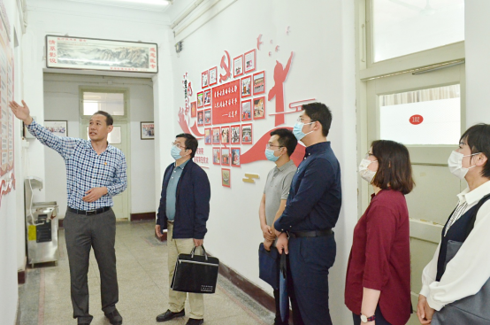 医疗技术党支部书记商其杰向考察验收组介绍支部文化创建成果