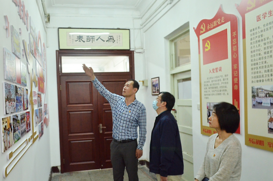 医疗技术党支部书记商其杰向考察验收组介绍支部教育教学成果