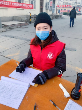 护理系18185班靳云彤,来自天津市静海区双塘镇八里庄村。她觉得,身为一名医学生倍感荣幸,同时身为一名积极分子一定要起到带头作用,尽一份薄弱的力量,所以她向八里庄村委提交了志愿申请。志愿者的工作主要是监督居民是否戴口罩出入,控制外来人员不得入内,检测进出的居民体温是否正常,定时消毒,发放通行证等。并宣传如何在家预防疾病的发生,如何消毒的小常识。将自己在学校学到的防护知识传播给更多的人。