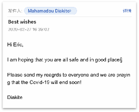 去年底顺利揭牌的马里鲁班工坊承建校巴马科科技大学副校长迪亚凯特教授代表学校通过邮件送来祝福,希望大家都是安全的,希望这次疫情早日结束!
