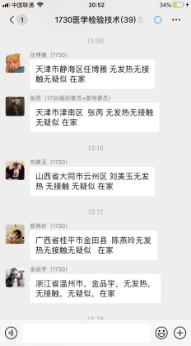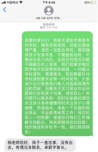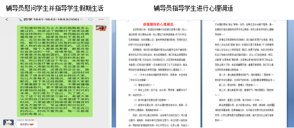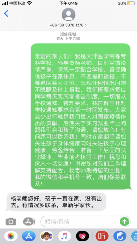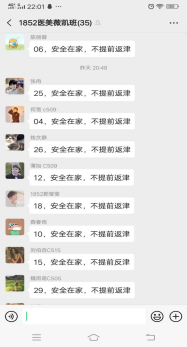 系领导建立留津留校学生联系群,引导学生认真落实学校防疫工作要求,指导学生做好假期留校学习生活,为同学们排忧解难。系学工办杨乐老师、罗丹老师,分别承担三个年级在防疫期间的实习生管理、健康排查工作等工作。特别是针对877名实习生,分布在天津、北京、上海、山东、武汉等地区实习,由于实习生春节假期回家,105人曾经停湖北地区,根据防疫工作要求指导学生居家观察、进行健康监测成为毕业班辅导员心头最大的压力。为指导学生积极配合社区工作,科学防疫、缓解心理焦虑,杨乐老师对所负责班级学生家长进行联络,与家长和学生说明暂缓实习的要求并了解居家观察情况。