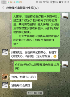 为深入贯彻落实习近平总书记关于防控新型冠状病毒感染的肺炎疫情的重要指示精神,根据学校疫情防控工作领导小组的要求,扎实做好学生工作,保障学生的平安和健康,药检医疗技术学工支部不忘守护学生的初心,牢记服务学生的使命,坚定信心、众志成城,着力把防控疫情工作落地落实落细,坚决打赢这场疫情防控阻击战,做好学生的暖心人。