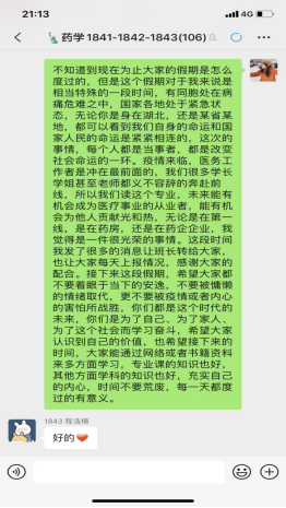 辅导员老师们也不忘做好学生思想上的引领,开展网络宣传,充分发挥学校、学工在线、系学生工作等微信公众号的宣传作用,强化思想引领,做好医学生职业教育和使命担当;加强正面引导,把疫情科学宣传作为防控疫情的积极手段,积极鼓励同学向家人普及疫情动态,消除恐慌,树立科学防控观念,引导学生不造谣、不信谣、不传谣,弘扬医学生精神,以实际行动践行初心使命。