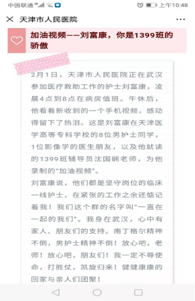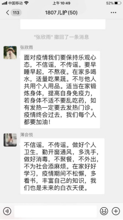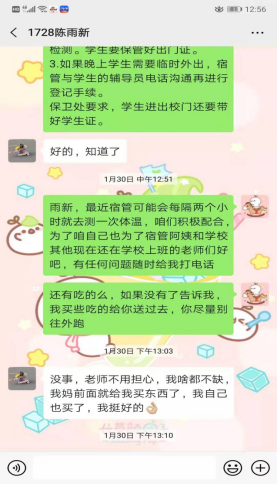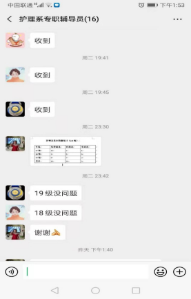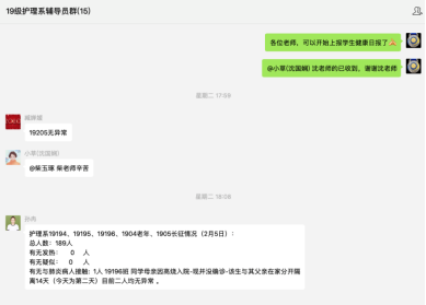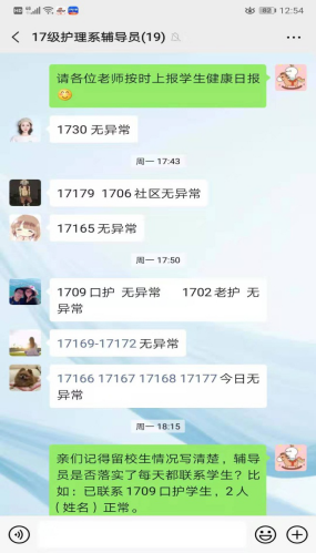 自1月22日起,护理系学工支部的辅导员们24小时在线,对学生进行实时人文关怀与帮助,了解学生健康状况,关注学生动态,指导学生掌握防控知识,摸底排查学生情况,做好留校学生的关心关爱工作,为学生制定假期学习和生活计划。对驰援武汉的护理系毕业生,辅导员给与叮嘱和助威,希望师生携手同心,共克时艰。