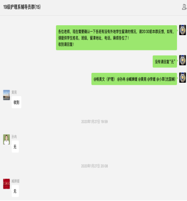 面对严峻的疫情形势,护理系学工支部的辅导员时刻把学生的安危放在第一位,主动了解每一位学生的健康动态,传播科学而正能量的声音,把每一位学生的工作做实做细。辅导员积极转发学校有关疫情防控的通知到QQ群、微信群中,传达学校防控工作精神,使每一位同学了解疫情有关情况,提醒同学们切勿提前返校,做好防疫措施;全面了解湖北武汉籍学生的身体健康情况,每天打电话询问有关情况。