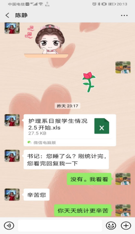 为了响应天津市防疫指挥部、天津市教委工委的要求,将工作做深,做细,做实。作为19级年级负责人的柴玉琢,虽工作不满半年,但工作非常细致、表格梳理清晰,每天负责将2019级912名学生的具体情况汇总上报,对于每个辅导员上报的数据了如指掌,工作做的非常精细,总能把每个特殊学生的情况摸排的非常仔细,指导新辅导员开展工作,解读任务。每天的数据就像四面八方的涓涓溪流,汇总到一起,形成了2019级的情况报告,融进护理系整体的学生工作“长河”,进而为学校的防疫工作做出应有的贡献。