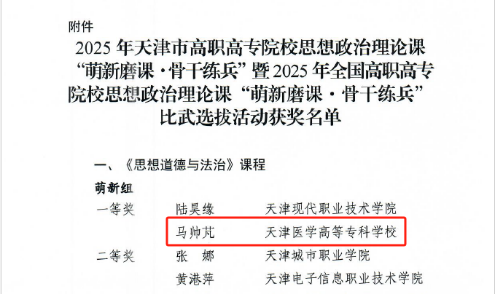 近日,天津市教育两委公布了2025年天津市高职高专院校思想政治理论课“萌新磨课·骨干练兵”比武选拔活动获奖名单。我校马克思主义学院两位教师在此次教学赛事中凭借扎实的理论功底、精湛的教学技艺和出色的现场发挥斩获佳绩。其中,马帅芃老师获《思想道德与法治》课“萌新磨课”组一等奖,刘建春老师获《毛泽东思想和中国特色社会主义理论体系概论》课“骨干练兵”组三等奖。