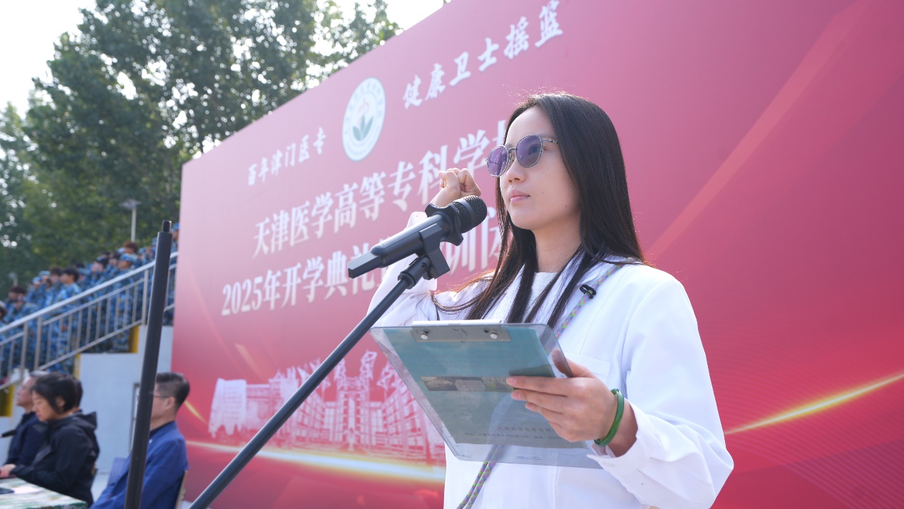 新生代表、护理25268班赵蕾然同学发言,她表达了成为“医专人”的荣耀与喜悦,展现了对未来学习生活的期望与信心。