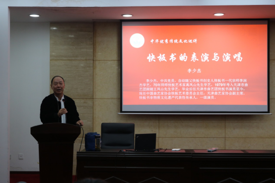 10月31日下午,2019年中华优秀传统文化高校巡讲活动“医专站”在我校第五会议室举行,活动邀请到快板表演艺术家李少杰老师为到场师生举办讲座。李老师自幼跟随其父亲、快板书创始人李润杰学艺,随后拜师快板艺术家高凤山先生,跟随王凤山先生学艺,现任中国曲艺家协会快板艺术委员会主任,天津曲艺家协会副主席,快板书非物质文化遗产代表性传承人,一级演员。校党委副书记、副校长左红与到场师生代表共同聆听了李老师的讲座。
