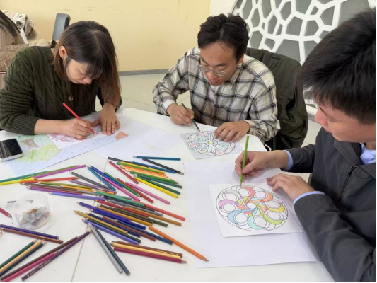 随后,培训进入体验式环节,在绘制“雨中人”时,辅导员们根据自身理解与感受,在画纸上描绘雨中的人物形象与场景,郑老师引导大家从画面构图、人物姿态、雨的形态等细节入手,解读画作背后隐藏的情绪状态与心理需求,并结合实际案例讲解如何通过画作分析学生的压力来源与应对模式。在“曼陀罗”绘画活动中,辅导员们围绕中心图案进行专注创作,运用丰富的色彩填涂专属曼陀罗作品。创作过程中,大家逐渐放松身心,沉浸在自我探索与表达的氛围中。完成创作后,郑老师带领辅导员们分享创作思路与内心感受,通过作品解析帮助大家理解曼陀罗绘画在情绪调节、自我整合方面的积极作用,并示范如何引导学生通过曼陀罗绘画缓解焦虑、梳理情绪。