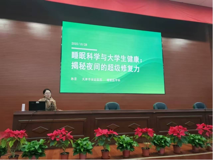 为积极响应学生群体对睡眠健康日益增长的需求,科学普及睡眠知识,提升学生心理调适能力,党委学工部大学生心理健康教育指导中心于2025年10月29日,特邀天津市安定医院睡眠科专家——孙芸副主任医师来校为同学们开展“睡眠科学与大学生心理健康”专题讲座。本次讲座聚焦“夜间修复力”这一核心概念,为同学们带来了一场关于睡眠健康的科学盛宴。