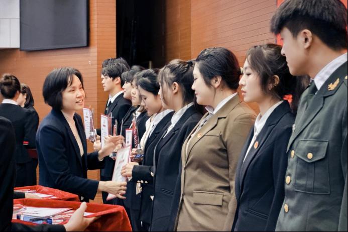 校党委书记舒珺为荣获2025年校级“十佳大学生”的十名学生颁发了荣誉证书和纪念奖杯。