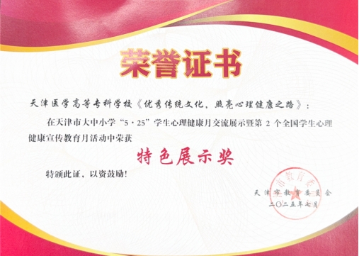 在2025年天津市“5·25”学生心理健康月活动中,我校积极参与多项主题活动,凭借扎实的组织工作和富有特色的活动设计,荣获特色活动展示奖证书,彰显了学校心理健康教育活动的吸引力和影响力。