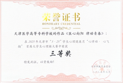 在天津市首届大学生心理操大赛“心律动·心飞扬”中,我校报送的作品《医心向阳 律动青春》荣获三等奖。该作品将医学人文精神与心理韵律相结合,通过富有创意的编排和充满感染力的表演,展现了医学生积极阳光、团结向上的精神风貌,获得了专家和观众的一致好评。