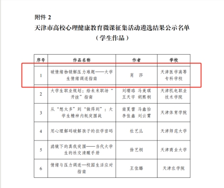 在天津市高校心理健康教育微课征集活动中,我校学生作品《破情绪枷锁解压力难题——大学生情绪调适指南》在全市众多参赛作品中脱颖而出,入选优秀学生作品。该作品立足医学生实际,结合专业特色,科学解析情绪管理方法,体现了我校学生良好的心理素养与创新能力。