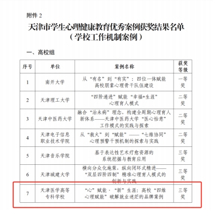 学校工作机制案例:《“心”赋能·“新”生涯:高校“四维心理赋能”破解就业迷茫的品牌案例》荣获三等奖;