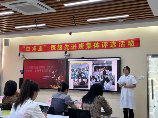本次活动中,由医学口腔各辅导员推荐,19个 “白求恩班级评选活动”候选班级参加初赛环节,经过医学口腔各位评委老师的打分和初评,最终共计10个班级进入了复赛环节。在“白求恩班级评选活动”的答辩过程中,10个候选班级代表依次上台发言,将自己班级丰富多彩、硕果累累的班集体荣誉娓娓道来。
