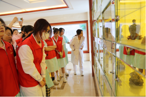 随后,在周老师的带领下,同学们来到中医药文化长廊参观学习。进入文化长廊,同学们被浓郁的中医药文化气息所吸引。在老师的讲解下,大家一起追随着中医药发展的历史脉络,感悟中医药文化的博大精深。一座座古代名中医雕像,一段段中医古籍文字,一个个饱含岁月的中药器皿,一株株珍贵的中草药,让同学们驻足观望、流连忘返,仿佛与古代的医者展开了一场时空对话,进一步领悟了大医精诚的医德精神。