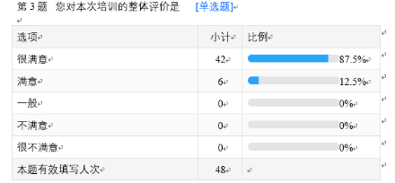 培训结束后,项目组对本期培训进行了满意度调查,学员对培训的整体评价满意度为100%。本项目为小班授课模式,每期50人,按计划今年还将开办3 期。