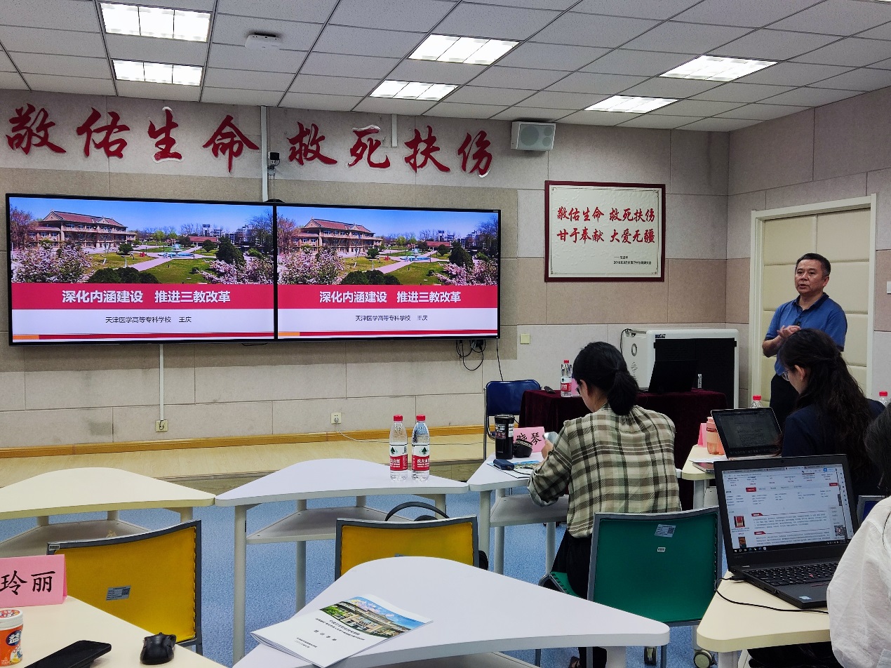 教务处景文莉处长开展《卫生职教特色在线精品课程的建设与应用》主题讲座,介绍我校系统推进“三教”改革,提升课程建设整体水平的成效与经验,强调深化内涵,突出重点,从梳理国家文件、做细顶层谋划、做精课程设计等六个方面扎实推进,打造国家级在线精品课程。药学与生物技术学院李悦副教授以《双高建设背景下药学专业群模块化课程改革探索与实践》为题,介绍了模块化课程改革设计思路,并以《药检仪器使用技术》等三门药物分析类课程为例,分享了课程改革的具体做法、效果评价及反思。医学护理学院海润玲副教授结合教学实际,进行了《课程思政浸润、岗课赛证融合的<急救护理>课程教学改革》主题分享,详细介绍了如何把岗融入课、把赛融入教,把证融入考,把思政融入学。马克思主义学院陈静副教授做了《教学能力比赛视域下思政课教学改革与课程思政融入的思考》主题讲座,从构建大思政工作格局、实施“三教”改革、以赛促变三方面总结了我校思政课教学改革的实践经验;同时,有针对性地分析了如何选择思政点,如何融入课程和教学设计,为课程思政有效融入路径提供参考。