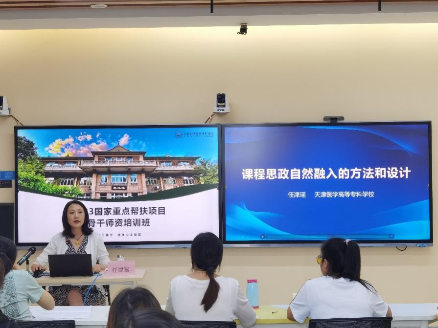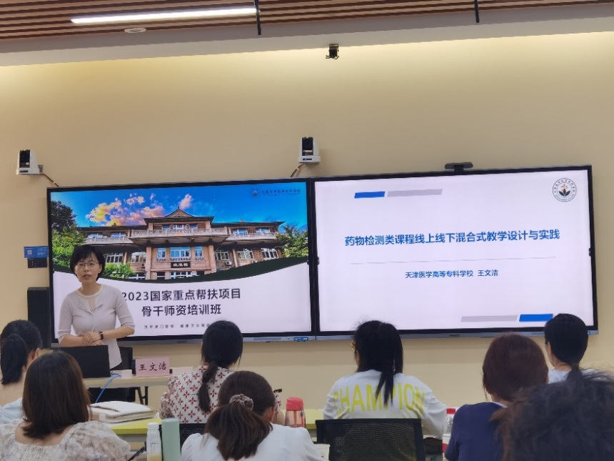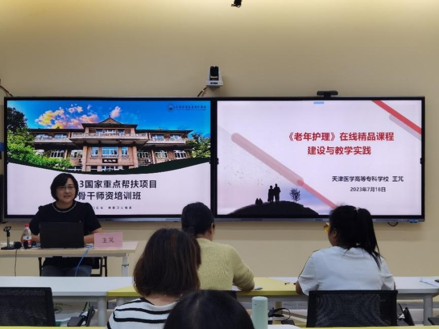 教师工作部副部长王文洁教授,以《药物检测类课程线上线下混合式教学设计与实践》为题,介绍课程建设历程,分享课程建设过程中的经验收获及反思,并指导参训教师进行微课脚本的撰写。党委办公室(校长办公室)副主任王芃教授,以《<老年护理>在线精品课程建设与教学实践》为题,对课程设计、教学改革、资源建设等方面进行了经验分享。