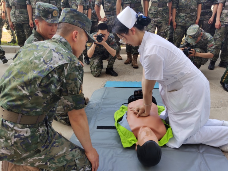 现场交流中,教师代表臧婵媛老师和学生代表徐敏同学为战士们展示了院外心肺复苏急救术及AED使用方法,和战士们共同配合展示了战场救护中止血包扎术与骨折固定术。