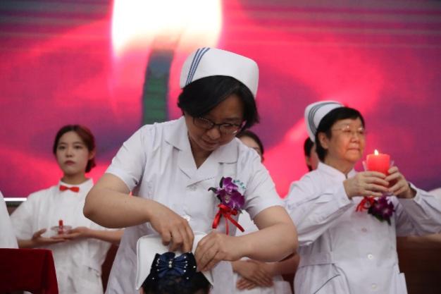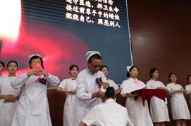 护士授帽仪式是护生成为护士的重要时刻,活动现场伴随着昂扬的乐曲声,全体护生代表依次上台,手捧护士帽,走到护理前辈面前单膝跪地,低头接受授帽。陈荣秀、夏欣华、法天锷三位前辈为我校优秀学生进行授帽。“洁白的燕尾帽象征着圣洁的天使……”伴随着神圣庄严的乐曲和饱含深情的解说,即将走上护理实习岗位的护生代表们依次上前,虔诚地接受前辈们为她们戴上圣洁的燕尾帽。在点燃代表传承南丁格尔精神的蜡烛后,教师代表王妍带领全体护生宣誓——奉行人道主义精神,坚定救死扶伤信念,遵守医德,捍卫生命,接过前辈手中的蜡烛,燃烧自己,照亮别人。