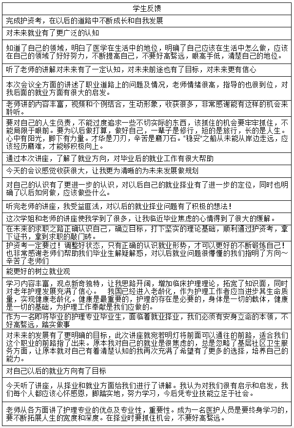 护理系希望通过优秀校友和专任教师的专题分享,使毕业生对就业形势认真思考,结合社会需求调整就业期望,树立“先就业、再择业”的就业观,顺利就业,同时,希望在校生既要仰望星空、更要脚踏实地,勤奋学习,不断提升自身的综合能力和实力,为今后的就业打下坚实的基础。今后,医护学院护理系将继续挖掘校友资源,搭建校友交流平台,发挥优秀校友的示范引领作用,助力学院就业工作再上新台阶。