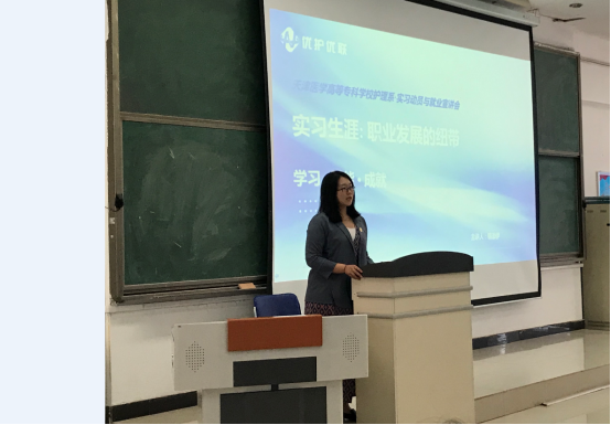 最后,为转变学生就业观念,拓宽就业渠道,此次动员会护理系特邀请韩添伊老师(我校2019届毕业生)做《当代护士的就业选择和职业发展》主题宣讲。