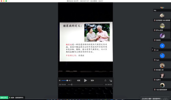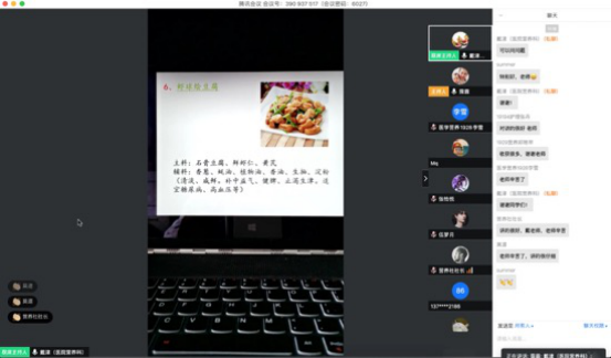 为了响应全民营养周活动,公卫系创新办会形式,将线下培训搬到线上举办。邀请中国人民解放军联勤保障部队天津康复疗养中心主管营养师戴津老师面向我校营养社学生,以药膳食疗为主题,就糖尿病患者日常中医养生与饮食治疗为内容开展培训。同学们踊跃报名,涉及医学营养、护理、医学美容、临床医学等专业共37人参加了培训。为了做好培训,让同学们既有理论学习又能有技能收获,公卫系将培训中的实践操作内容以视频的形式在讲解中穿插播放,丰富了培训的内容,活跃了培训的氛围。培训后又将课程内容上传职教云,组成云班级,方便同学们复习,重放操作。让同学们做到课有所学,学有所练。