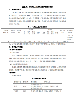 制度和周报告制度,对每日线上教学情况、学生上课情况、存在问题等进行监测与反馈,发现问题,及时解决。在总结本周教学运行情况、教学组织与实施、教学监控与评价、存在问题与改进措施的基础上,进一步挖掘线上教学典型案例,总结有效方法与举措,注重线上教学经验交流与推广。