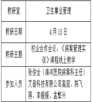 3.加强线上教研与听课。各教研室扎实开展线上集体教研,加强外聘教师教研,并与天津市口腔医院、海河医院病案科、艾登科技有限公司开展校院/企联合教研,以研促教,教研相长。本周开展了以线上教学经验交流、线上课程建设、17级毕业考核安排、综合技能实训课程线上教学组织、线上期中考试部署等为主题的线上集体教研共38次。同时,切实落实线上听课,本周共开展学校、系部、教研室及教师层面听课81人次,及时了解教学实施过程,加强对线上教学工作的指导、督促与服务。