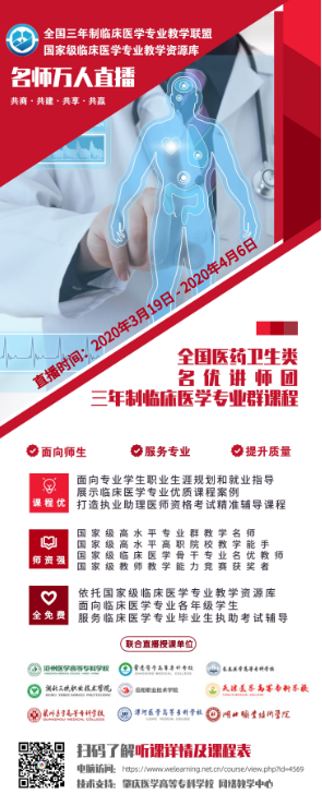 据悉,这堂“名师在线直播课”,是全国三年制临床医学专业教学联盟为了落实教育部提出的疫情防控期间“停课不停学”要求,进一步加强临床医学专业资源库的建设与应用,开展的“名优讲师团在线直播课”活动。活动从联盟院校中精心遴选出10位优秀教学名师,先后推出基础与临床课程的直播课。杨旭老师曾在天津医学高等专科学校领导专家的指导下,在天津市教学能力大赛中获奖,所以被推选为本次直播课的主讲。