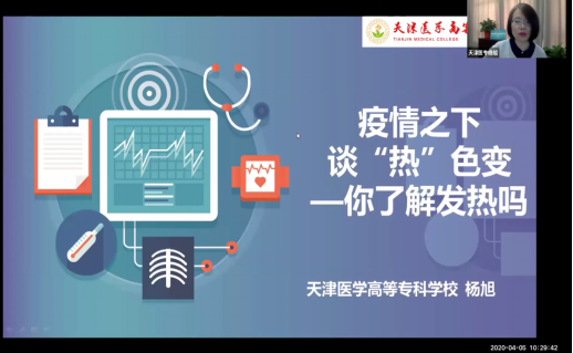 2020年4月5日上午,天津医专举办了一场创新形式的网络直播讲座。医学系诊断学教研室负责人杨旭老师,激情开讲《疫情之下,谈“热”色变——你了解发热吗?》。“疫情期间,发热真的那么可怕吗?我们应该如何正确的应对发热?作为医生,接诊到不同发热病人,我们应该如何按图索骥,层层破解病因?”本次讲座,内容引人入胜,形式丰富新颖,吸引了全国十余所高职医学院校的5000余名学生共同在线参与,直播间互动交流气氛热烈。