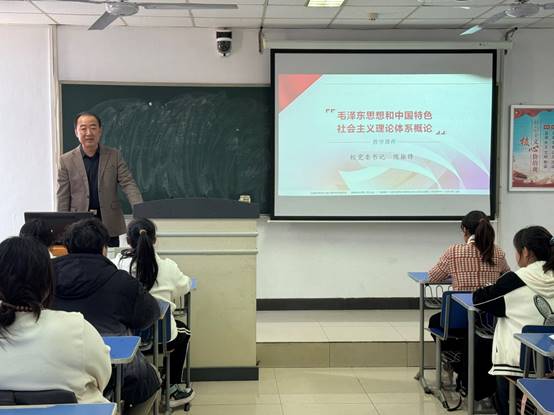 为深入学习贯彻习近平总书记关于思政课建设的重要论述,进一步增强学校思想政治工作的针对性、实效性,根据学校领导干部带头讲好思政课相关工作要求,从第三周开始,校系两级领导陆续登上思政课讲台,当好学生的思想引路人。2025年3月6日下午,我校党委书记陈振锋在教学楼C313教室,为2024级针灸推拿专业同学讲授《毛泽东思想和中国特色社会主义体系概论》第一课。