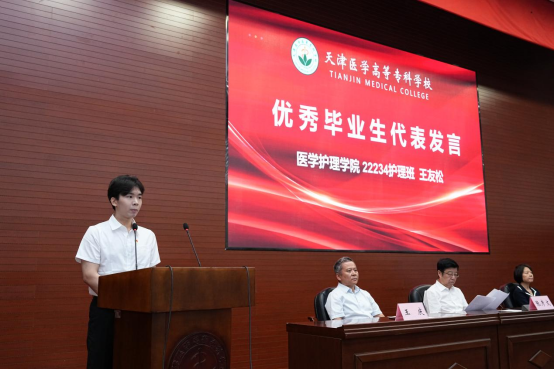 医学护理学院王友松作为优秀毕业生代表发言。他分享了自己的成长历程,感谢母校赋予的足以支撑学子一生职业发展的深厚根基与独特烙印。他号召全体毕业生将“小我”融入“大我”,用青春和热血去践行医者使命,为健康中国事业贡献力量。