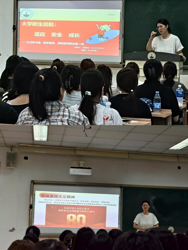 入学适应部分,老师们重点分享了大学生适应调节的实用方法,助力新生快速融入校园生活;健康宣讲环节则聚焦流行性疾病的预防与应对,明确强调了疫苗接种的必要性,以及勤洗手、科学戴口罩等个人卫生习惯和环境通风的重要性,旨在帮助新生提升自我健康管理能力;安全教育模块涵盖宿舍用电安全、消防安全与交通安全三大核心内容,其中宿舍用电安全为重点强调方向,明确禁止使用大功率电器,同时着重培养新生“隐患自查” 意识,从源头避免校园火灾风险;校园文明生活指导环节,以《校园管理条例》和《学生手册》为核心依据,明确对新生提出课堂纪律、宿舍卫生、礼仪交往等多方面要求。通过清晰的规范引导,帮助新生逐步养成自律习惯,进而共同维护校园良好秩序;针对“校园贷”“刷单返利”“冒充客服”等新生高发诈骗类型,老师们结合真实案例拆解诈骗套路,向新生传授“三不一要”应对方法——即不轻信、不透露、不转账,遇疑及时报警,并现场指导新生安装“国家反诈中心”APP;通过九三大阅兵展现的强国风采与国家公共卫生事业发展取得的卓越成就激发新生的民族自豪感,引导他们将“守护人民健康”的专业目标与国家需求相结合,厚植爱国主义精神。