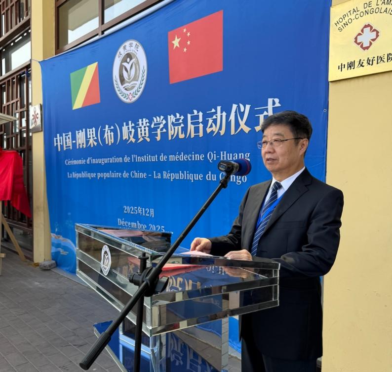 我校张彦文校长在主持启动仪式时谈到,“中医药作为中华民族的瑰宝,承载着服务民众千年的健康智慧;刚果(布)也拥有丰富的传统医药资源,同时刚果民众有着广泛的健康需求,两国在卫生领域的合作源远流长、根深叶茂。岐黄学院的成立,既是中刚友好合作的新延伸,更是两国卫生健康领域合作的新实践。”