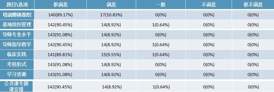 目前,176名学员全部培训合格,评估数据显示:学员对培训整体组织、基地管理、导师水平、临床实践、学习资源、考核形式、公共课专题课安排等各项指标满意度评价均超过99%,且“很满意”占比均在90%左右。自评培训与实际工作契合度为98.73%,自评专业能力提升度为89.71%。 项目办后续将根据金牌家医团队建设标准开展延伸性效果评估。