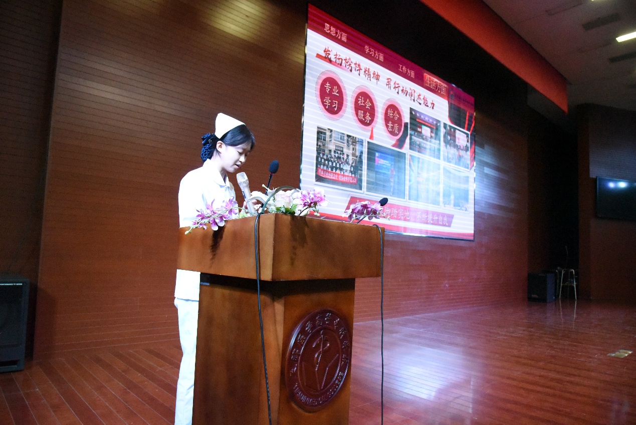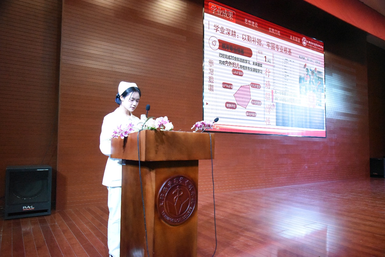 护理党支部书记商其杰在开场致辞中,勉励学子秉持严谨治学态度,将专业学习与社会责任相结合,在深耕专业中厚植家国情怀,明确学风建设的实践方向。随后,国家奖学金获得者陈威帆、张艺凡、杨洋洋三位同学,以“医学生的成长答卷”为主线,分享了从理论课堂深耕、实训实践锤炼到临床见习历练的成长历程。他们用真挚的话语讲述面对患者时的初心坚守与能力蜕变,传递出对医学专业的敬畏与理想追求,让“勤学善思”的学风内涵变得具象可感,引发全场强烈共鸣。