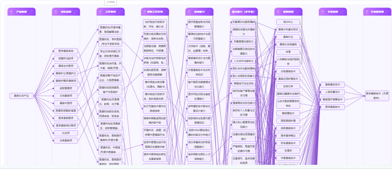 我校贯彻落实新版专业教学标准,全面修订2025级人才培养方案,围绕提升专业与产业匹配度开展调研,形成专业能力框架、岗位任务清单,绘制22个“岗位-能力-课程”关联能力图谱。在此基础上,遴选包括护理、药学、医学美容技术专业群核心专业在内的 6 个基础扎实、特色鲜明的优势专业,引入人工智能辅助手段,开发高标版专业能力图谱,研制对应岗位群的岗位能力、典型工作任务清单。同时,借助AI人才预测大模型,开展全校专业动态调整宏观分析及新专业设置分析。