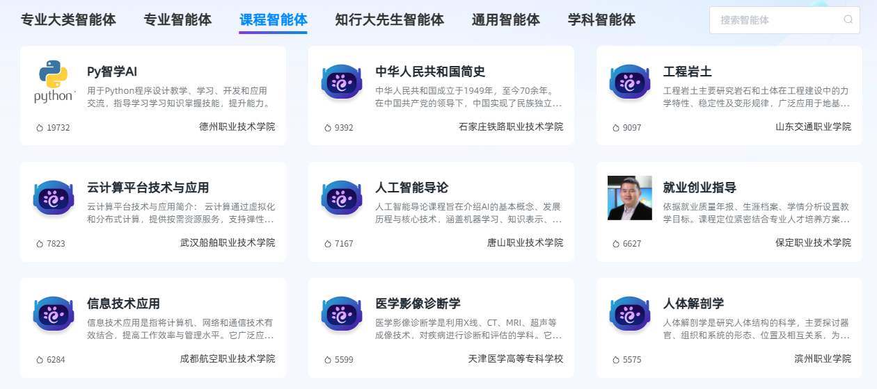 智能体驱动教学,专属助手赋能课堂。基于“结构化知识库、过程性场景库、交互性语料库”构建多模态、全场景语料体系,开展课程专属智能体训练,通过深度专业化,使其更优的适配教育教学场景,现已有15个课程专属智能体上线智慧职教智能体广场,其中2门课程热度排名前10。专属教学智能体的引入,变革了传统课堂的互动与服务模式,24小时在线即时答疑“数字助教”,延伸了教学支持的时间和空间,基于对学生个性化问题分析,提供学习辅导、知识及相关资源推送,不仅有利于提升学生自主性与获得感,也促进了教学模式从“以教为中心”向“以学为中心”的探索转型。