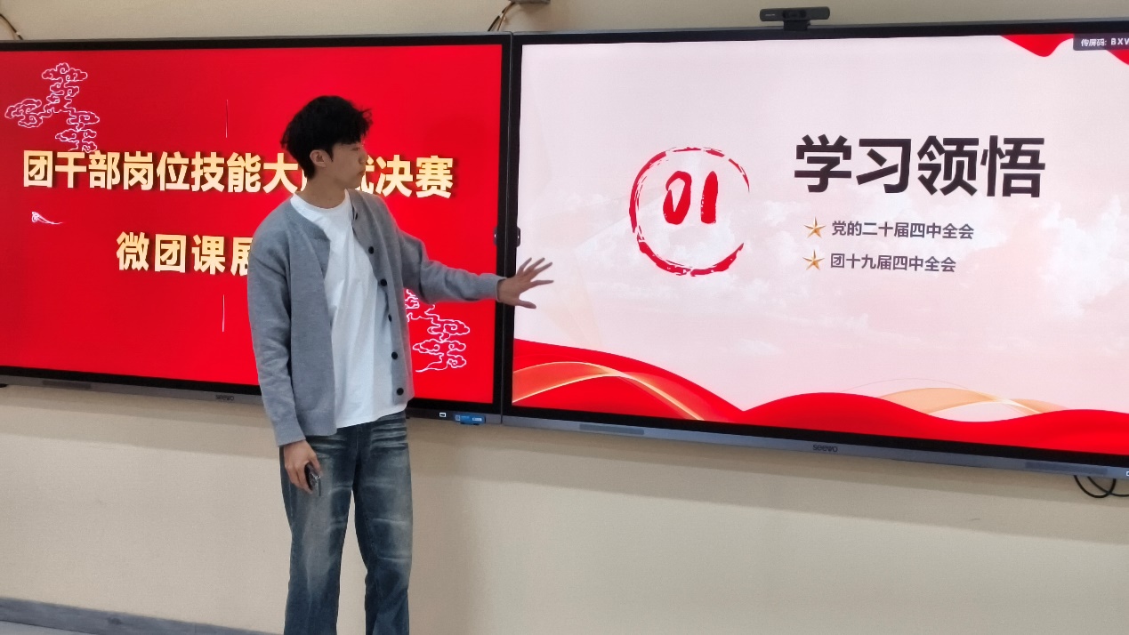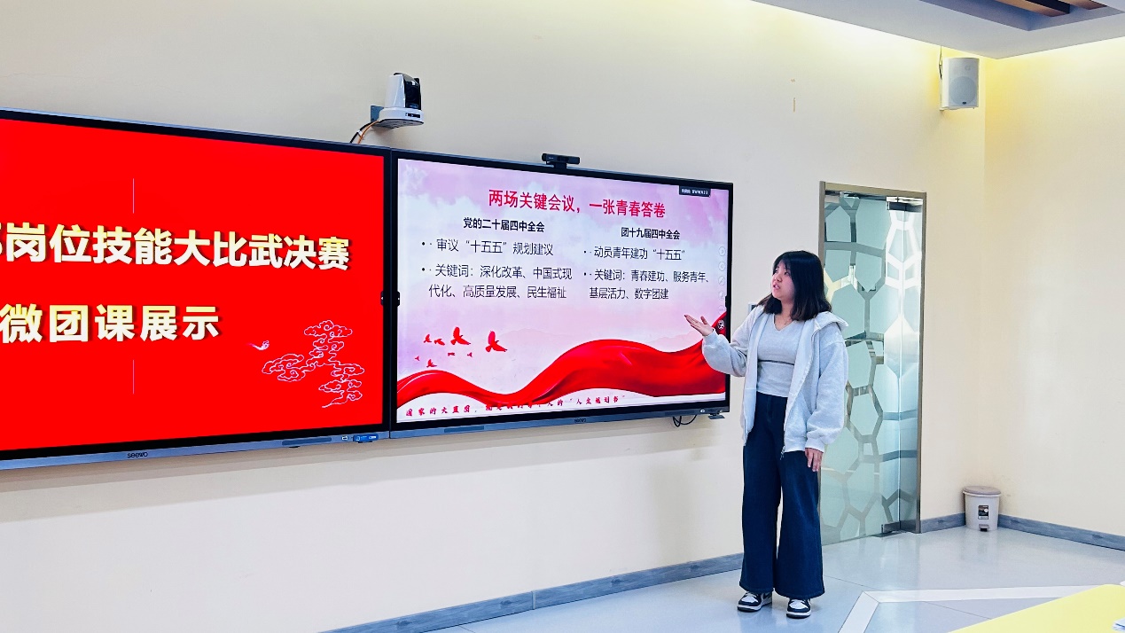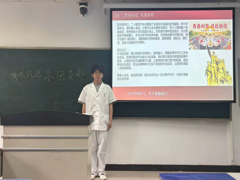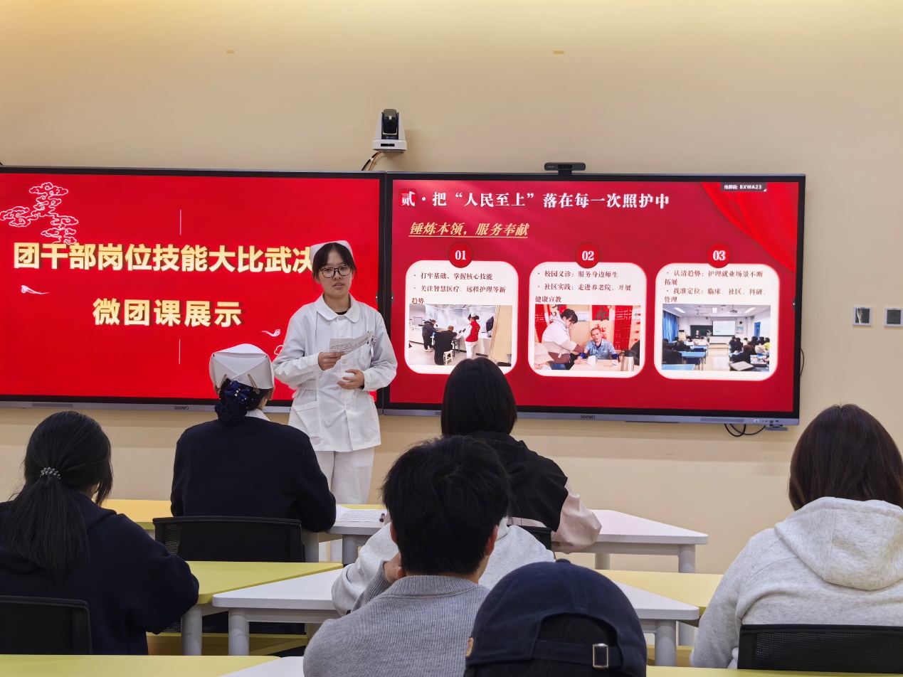 综合履职比拼包含业绩报告与微团课展示两大核心模块。业绩报告环节,参赛团干部立足团务岗位,客观总结工作成效、梳理经验不足、明确改进方向,全面展现履职尽责的实干成果;微团课展示紧扣党的二十届四中全会精神、共青团十九届四中全会精神,结合医专校园实际与青年特点,用”青言青语”讲理论、用鲜活事例谈感悟,创新授课形式,增强思想引领的感染力与实效性,传递青春正能量。